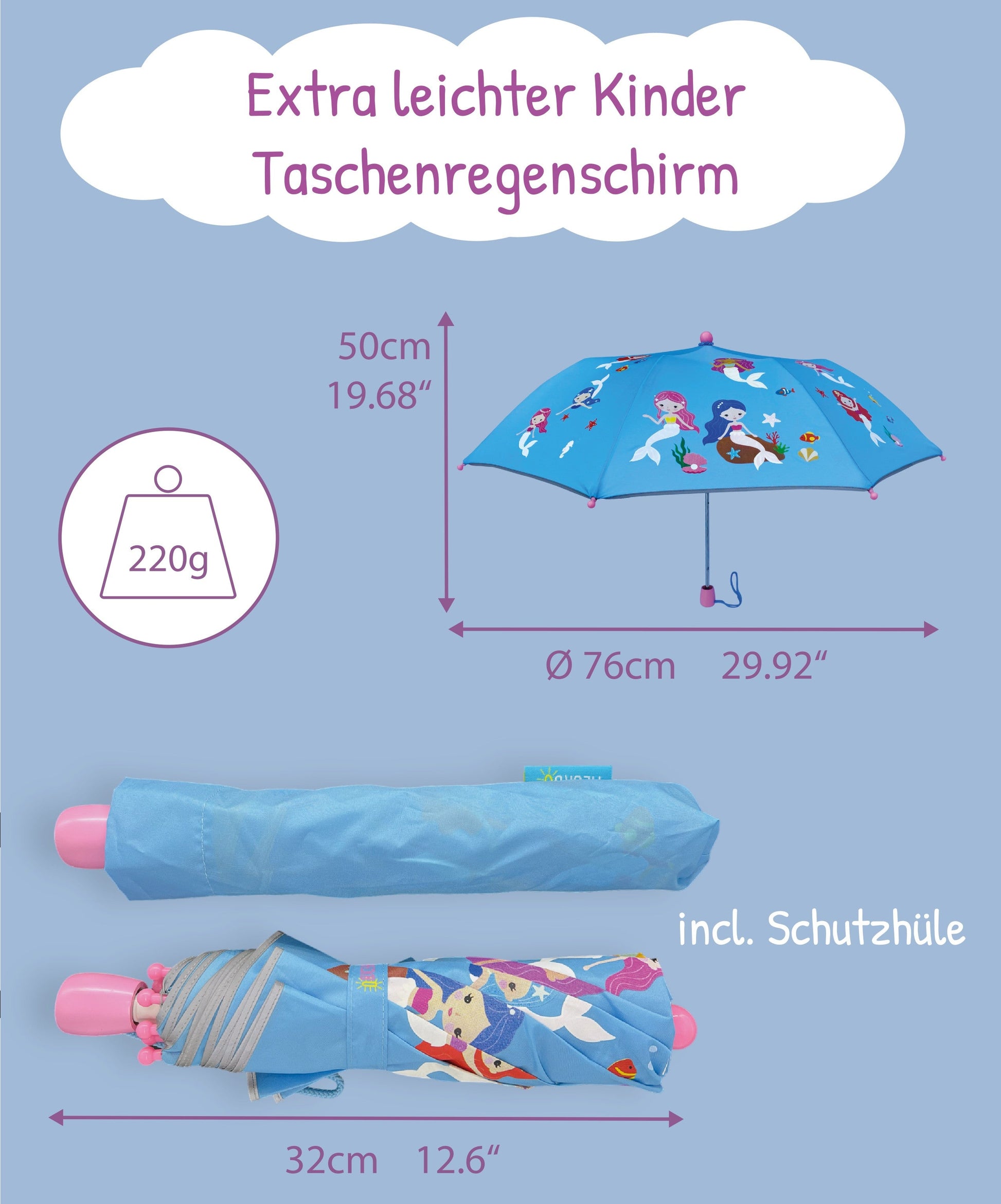 Ein Schirm voller Zauber: Sobald Regentropfen fallen, verwandeln sich die weißen Motive – darunter z. B. die Schwanzflossen der Meerjungfrauen – in farbenfrohe Akzente. Nach dem Trocknen erscheinen sie wieder in ihrem ursprünglichen Weiß. Dieses magische Farbspiel sorgt für staunende Kinderaugen und bringt Freude an grauen Regentagen. Ein besonderes Geschenk für alle kleinen Meerjungfrauen-Fans.